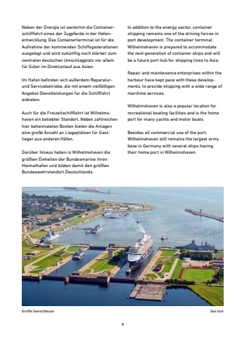 8Neben der Energie ist weiterhin die Containerschifffahrt eines der Zugpferde in der Hafenentwicklung. Das Containerterminal ist f%u00fcr die Aufnahme der kommenden Schiffsgenerationen ausgelegt und wird zuk%u00fcnftig noch st%u00e4rker zum zentralen deutschen Umschlagplatz vor allem f%u00fcr G%u00fcter im Direktanlauf aus Asien.Im Hafen befinden sich au%u00dferdem Reparaturund Servicebetriebe, die mit einem vielf%u00e4ltigen Angebot Dienstleistungen f%u00fcr die Schifffahrt anbieten.Auch f%u00fcr die Freizeitschifffahrt ist Wilhelmshaven ein beliebter Standort. Neben zahlreichenhier beheimateten Booten bieten die Anlagen eine gro%u00dfe Anzahl an Liegepl%u00e4tzen f%u00fcr Gastlieger aus anderen H%u00e4fen.Dar%u00fcber hinaus haben in Wilhelmshaven die gr%u00f6%u00dften Einheiten der Bundesmarine ihren Heimathafen und bilden damit den gr%u00f6%u00dften Bundeswehrstandort Deutschlands.In addition to the energy sector, containershipping remains one of the driving forces in port development. The container terminalWilhelmshaven is prepared to accommodate the next generation of container ships and will be a future port hub for shipping lines to Asia.Repair and maintenance enterprises within the harbour have kept pace with these developments, to provide shipping with a wide range of maritime services.Wilhelmshaven is also a popular location for recreational boating facilities and is the home port for many yachts and motor boats.Besides all commercial use of the port,Wilhelmshaven still remains the largest army base in Germany with several ships having their home port in Wilhelmshaven.Gro%u00dfe Seeschleuse Sea lock