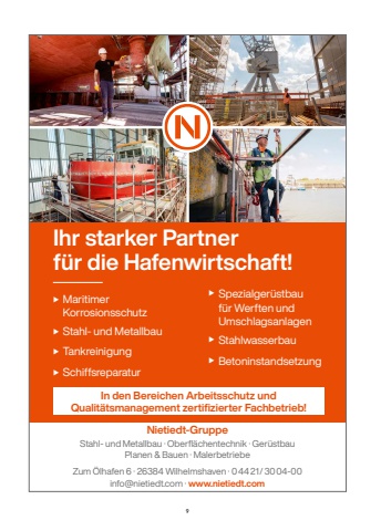 9Nietiedt-GruppeStahl- und Metallbau %u00b7 Oberfl%u00e4chentechnik %u00b7 Ger%u00fcstbauPlanen & Bauen %u00b7 Malerbetriebe Zum %u00d6lhafen 6 %u00b7 26384 Wilhelmshaven %u00b7 0%u200944%u200921%u2009/%u200930%u200904-00info@nietiedt.com %u00b7 www.nietiedt.comIhr starker Partner f%u00fcr die Hafenwirtschaft!Maritimer KorrosionsschutzStahl- und Metallbau TankreinigungSchiffsreparaturStahlwasserbauBetoninstandsetzungSpezialger%u00fcstbauf%u00fcr Werften undUmschlagsanlagenuuuuuuuIn den Bereichen Arbeitsschutz und Qualit%u00e4tsmanagement zertifizierter Fachbetrieb!