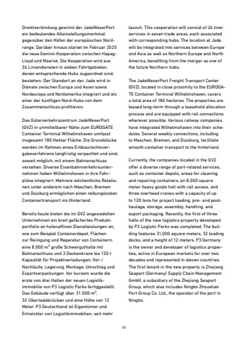 16Direktverbindung gewinnt der JadeWeserPort ein bedeutendes Alleinstellungsmerkmal gegen%u00fcber den H%u00e4fen der europ%u00e4ischen Nordrange. Dar%u00fcber hinaus startet im Februar 2025 die neue Gemini-Kooperation zwischen HapagLloyd und Maersk. Die Kooperation wird aus26 Liniendiensten in sieben Fahrtgebieten, denen entsprechende Hubs zugeordnet sind, bestehen. Der Standort an der Jade wird in Dienste zwischen Europa und Asien sowie Nordeuropa und Nordamerika integriert und als einer der k%u00fcnftigen Nord-Hubs von demZusammenschluss profitieren. Das G%u00fcterverkehrszentrum JadeWeserPort (GVZ) in unmittelbarer N%u00e4he zum EUROGATE Container Terminal Wilhelmshaven umfasst insgesamt 180 Hektar Fl%u00e4che. Die Grundst%u00fccke werden im Rahmen eines Erbbaurechtsvergabeverfahrens langfristig verpachtet und sind, soweit m%u00f6glich, mit einem Bahnanschlussversehen. Diverse Eisenbahnverkehrsunternehmen haben Wilhelmshaven in ihre Fahrpl%u00e4ne integriert. Mehrere w%u00f6chentliche Relationen unter anderem nach Maschen, Bremenund Duisburg erm%u00f6glichen einen reibungslostenContainertransport ins Hinterland. Bereits heute bieten die im GVZ angesiedelten Unternehmen ein breit gef%u00e4chertes Produktportfolio an hafenaffinen Dienstleistungen an, wie zum Beispiel Containerdepot, Fl%u00e4chenzur Reinigung und Reparatur von Containern, eine 8.000 m%u00b2 gro%u00dfe Schwerguthalle mitBahnanschluss und 3 Deckenkrane bis 120 t Kapazit%u00e4t f%u00fcr Projektverladungen, Vor-/Nachl%u00e4ufe, Lagerung, Montage, Umschlag und Exportverpackungen. Vor kurzem wurde die erste von drei Hallen der neuen Logistikimmobilie von P3 Logistic Parks fertiggestellt.Das Geb%u00e4ude verf%u00fcgt %u00fcber 31.000 m%u00b2,32 %u00dcberladebr%u00fccken und eine H%u00f6he von 12Meter. P3 Deutschland ist Eigent%u00fcmer undEntwickler von Logistikimmobilien, seit mehr launch. This cooperation will consist of 26 liner services in seven trade areas, each associated with corresponding hubs. The location at Jade will be integrated into services between Europe and Asia as well as Northern Europe and North America, benefiting from the merger as one of the future Northern hubs.The JadeWeserPort Freight Transport Center (GVZ), located in close proximity to the EUROGATE Container Terminal Wilhelmshaven, covers a total area of 180 hectares. The properties are leased long-term through a leasehold allocation process and are equipped with rail connections wherever possible. Various railway companies have integrated Wilhelmshaven into their schedules. Several weekly connections, including to Maschen, Bremen, and Duisburg, facilitate smooth container transport to the hinterland.Currently, the companies located in the GVZ offer a diverse range of port-related services, such as container depots, areas for cleaning and repairing containers, an 8,000 squaremeter heavy goods hall with rail access, and three overhead cranes with a capacity of upto 120 tons for project loading, pre- and posthaulage, storage, assembly, handling, andexport packaging. Recently, the first of three halls of the new logistics property developedby P3 Logistic Parks was completed. The building features 31,000 square meters, 32 loading docks, and a height of 12 meters. P3 Germany is the owner and developer of logistics properties, active in European markets for over two decades and represented in eleven countries. The first tenant in the new property is Zhejiang Seaport (Germany) Supply Chain Management GmbH, a subsidiary of the Zhejiang Seaport Group, which also includes Ningbo Zhoushan Port Group Co. Ltd., the operator of the port in Ningbo.