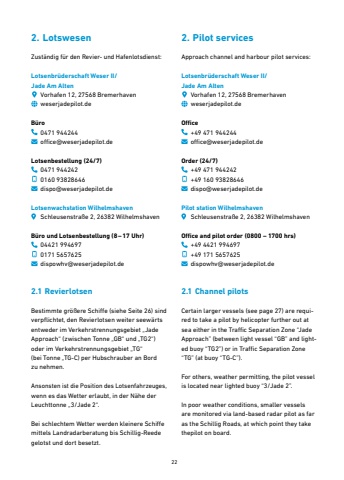 22Zust%u00e4ndig f%u00fcr den Revier- und Hafenlotsdienst:Lotsenbr%u00fcderschaft Weser II/Jade Am AltenVorhafen 12, 27568 Bremerhavenweserjadepilot.deB%u00fcro0471 944244office@weserjadepilot.deLotsenbestellung (24/7)0471 9442420160 93828646dispo@weserjadepilot.deLotsenwachstation WilhelmshavenSchleusenstra%u00dfe 2, 26382 WilhelmshavenB%u00fcro und Lotsenbestellung (8%u201317 Uhr)04421 9946970171 5657625dispowhv@weserjadepilot.deApproach channel and harbour pilot services:Lotsenbr%u00fcderschaft Weser II/Jade Am AltenVorhafen 12, 27568 Bremerhavenweserjadepilot.deOffice+49 471 944244office@weserjadepilot.deOrder (24/7)+49 471 944242+49 160 93828646dispo@weserjadepilot.dePilot station WilhelmshavenSchleusenstra%u00dfe 2, 26382 WilhelmshavenOffice and pilot order (0800 %u2013 1700 hrs)+49 4421 994697+49 171 5657625dispowhv@weserjadepilot.de2. Lotswesen 2. Pilot services2.1 Revierlotsen 2.1 Channel pilotsBestimmte gr%u00f6%u00dfere Schiffe (siehe Seite 26) sind verpflichtet, den Revierlotsen weiter seew%u00e4rts entweder im Verkehrstrennungsgebiet %u201eJade Approach%u201c (zwischen Tonne %u201eGB%u201c und %u201eTG2%u201c) oder im Verkehrstrennungsgebiet %u201eTG%u201c(bei Tonne %u201eTG-C) per Hubschrauber an Bordzu nehmen.Ansonsten ist die Position des Lotsenfahrzeuges,wenn es das Wetter erlaubt, in der N%u00e4he der Leuchttonne %u201e3/Jade 2%u201c.Bei schlechtem Wetter werden kleinere Schiffe mittels Landradarberatung bis Schillig-Reede gelotst und dort besetzt.Certain larger vessels (see page 27) are required to take a pilot by helicopter further out at sea either in the Traffic Separation Zone %u201cJadeApproach%u201d (between light vessel %u201cGB%u201d and lighted buoy %u201cTG2%u201d) or in Traffic Separation Zone %u201cTG%u201d (at buoy %u201cTG-C%u201d).For others, weather permitting, the pilot vessel is located near lighted buoy %u201c3/Jade 2%u201d.In poor weather conditions, smaller vessels are monitored via land-based radar pilot as far as the Schillig Roads, at which point they take thepilot on board.