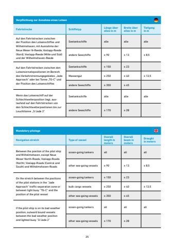 25Verpflichtung zur Annahme eines LotsenFahrtstrecke Schiffstyp L%u00e4nge %u00fcber alles in mBreite %u00fcber alles in mTiefgang in mAuf den Fahrtstrecken zwischender Position des Lotsenschiffes und Wilhelmshaven, mit Ausnahme der Neue Weser N-Reede, Voslapp-Reede (Nord), Voslapp-Reede (Mitte und S%u00fcd) und der Wilhelmshaven-ReedeSeetankschiffe alle alle alleandere Seeschiffe %u2265 90 %u2265 13 %u2265 8,5Auf den Fahrtstrecken zwischen den Lotsenversetzpositionen im Bereich des Verkehrstrennungsgebietes %u201eJade Approach%u201c oder bei Tonne %u201eTG-C%u201c und der Position des LotsenschiffesSeetankschiffe %u2265 150 %u2265 23Massengut %u2265 250 %u2265 40 %u2265 13,5andere Seeschiffe %u2265 350 %u2265 45Wenn das Lotsenschiff auf der Schlechtwetterposition liegt, auslaufend auf den Fahrtstrecken von den Schlechtwetterpositionen bis zur Leuchttonne %u201e3/Jade 2%u201cSeetankschiffe alle alle alleandere Seeschiffe %u2265 170 %u2265 28Mandatory pilotageNavigation stretch Type of vesselOveralllength inmetersOverallbeam inmetersDraughtin metersBetween the position of the pilot ship and Wilhelmshaven, except Neue Weser North-Roads, Voslapp-Roads (North), Voslapp-Roads (Central and South) and Wilhelmshaven-Roadsocean-going tankers all all allother sea-going vessels %u2265 90 %u2265 13 %u2265 8,5On the stretch between the positionsof the pilot stations in the %u201cJade Approach%u201d traffic separation zone or between light buoy %u201cTG-C%u201d and the position of the pilot vesselocean-going tankers %u2265 150 %u2265 23bulk cargo vessels %u2265 250 %u2265 40 %u2265 13,5other sea-going vessels %u2265 350 %u2265 45If the pilot ship is on its bad weatherposition, outward bound vesselsbetween the bad weather positionand lighted buoy %u201c3/Jade 2%u201docean-going tankers all all allother sea-going vessels %u2265 170 %u2265 28