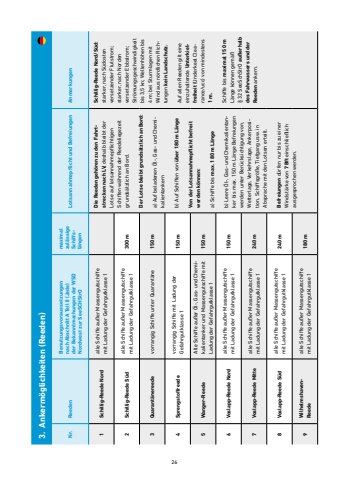 263. Ankerm%u00f6glichkeiten (Reeden)Nr. ReedenBenutzungsvoraussetzungen nach Abschnitt A Teil II (Jade) der Bekanntmachungen der WSD Nordwest zur SeeSCHStrO maximal zul%u00e4ssige Schiffs- l%u00e4ngen Lotsannahmepflicht und Befreiungen Anmerkungen1 Schillig-Reede Nord alle Schiffe au%u00dfer Massengutschiffe mit Ladung der Gefahrgutklasse 1 Die Reeden geh%u00f6ren zu den Fahrt- strecken nach LV, deshalb bleibt der Lotse auf lotsannahmepflichtigen Schiffen w%u00e4hrend der Reedeliegezeit grunds%u00e4tzlich an Bord. Der Lotse bleibt grunds%u00e4tzlich an Bord: a) Auf beladenen %u00d6l-, Gas- und Chemikalientankern b) Auf Schiffen von %u00fcber 180 m L%u00e4nge Von der Lotsannahmepflicht befreit werden k%u00f6nnen: a) Schiffe bis max. 180 m L%u00e4nge b) Leere %u00d6l-, Gas- und Chemikalientan- ker bis max. 150 m L%u00e4nge Befreiungen werden unter Ber%u00fccksichtigung von, Wetterlage, Verkehrslage, Ankerposition, Schiffsgr%u00f6%u00dfe, Tiefgang usw. in Absprache mit den Lotsen erteilt. Befreiungen d%u00fcrfen nur bis zu einer Windst%u00e4rke von 7 Bft einschlie%u00dflich ausgesprochen werden. Schillig-Reede Nord/S%u00fcd: starker, nach S%u00fcdosten versetzender Flutstrom; starker, nach Norden versetzender Ebbstrom; Str%u00f6mungsgeschwindigkeit bis 3,5 kn; Wellenh%u00f6hen bis 4 m; bei Sturmlagen mit Wind aus n%u00f6rdlichen Rich- tungen kein Landschutz. Auf allen Reeden gilt eine einzuhaltende Unterkiel- freiheit (Underkeel Clea- rance/ucc) von mindestens 1 m. Schiffe bis maximal 150 m L%u00e4nge k%u00f6nnen gem%u00e4%u00df %u00a7 32 SeeSchStrO au%u00dferhalb des Fahrwassers und der Reeden ankern. 2 Schillig-Reede S%u00fcd alle Schiffe au%u00dfer Massengutschiffe mit Ladung der Gefahrgutklasse 1 300 m 3 Quarant%u00e4nereede vorrangig Schiffe unter Quarant%u00e4ne 150 m 4 Sprengstoffreede vorrangig Schiffe mit Ladung der Gefahrgutklasse 1 150 m 5 Wanger-Reede Alle Schiffe au%u00dfer %u00d6l-, Gas- und Chemi- kalientanker und Massengutschiffe mit Ladung der Gefahrgutklasse 1 150 m 6 Voslapp-Reede Nord alle Schiffe au%u00dfer Massengutschiffe mit Ladung der Gefahrgutklasse 1 150 m 7 Voslapp-Reede Mitte alle Schiffe au%u00dfer Massengutschiffe mit Ladung der Gefahrgutklasse 1 240 m 8 Voslapp-Reede S%u00fcd alle Schiffe au%u00dfer Massengutschiffe mit Ladung der Gefahrgutklasse 1 240 m9 Wilhelmshaven- Reede alle Schiffe au%u00dfer Massengutschiffe mit Ladung der Gefahrgutklasse 1 180 m