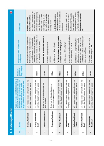 273. Anchorage (Roads)Nr. ReedenTypes of vessels permitted according to Section A Part II (Jade) of the Notices of the northwest regional Waterways and Shipping Directorate on the Traffic Regulations for Navigable Waterways Maximum permitted ship%u2019s length Obligation to take on pilot and exemptions Comments1 Schillig/Roadstead North All vessels except bulk goods carriers carrying Class 1 dangerous goods According to the Piloting Regulations (Lotsverordnung) roadsteads are to be considered part of the navigable channel. For this reason, while a ship is lying in the roads, an obligatory pilot will generally remain on board. As a rule the pilot remains on board: a) tankers carrying oil, gas or chemicals b) ships over 180 m in length The following types of vessel may be exempted from enlisting a pilot: a) ships up to 180 m in length b) empty oil, gas and chemical tankers with a length of up to 150 m. Exemptions will be granted by the pilots subject to favourable weather and traffic conditions, taking into ac- count factors such as anchor position, ship size, draught etc. Exemptions may only be granted at wind forces of up to 7 bft. Schillig Roadsteads North/South flood tide currents are strong, setting southeastwards; ebb tide currents are strong setting towards the north; tidal currents up to 3.5 knots; wave heights up to 4 m; shore affords no shelter in storm conditions with northerly winds. An Underkeel Clearance (UKC) regulation of at least 1 m must be observed at all roadsteads. In accordance with %u00a732 of the SeeSchStrO (Traffic Regulations for Navigable Waterways), ships with lengths of up to 150 m are permitted to anchor outside the fairway and roadste- ads.2 Schillig/Roadstead South All vessels except bulk goods carriers carrying Class 1 dangerous goods 300 m3 Quarantine Roadstead Priority given to vessels subjected to quarantine 150 m4 Explosives Roadstead Priority given to vessels carrying Class 1 dangerous goods 150 m5 Wanger Roadstead All vessels except bulk goods carriers carrying Class 1 dangerous goods 150 m6 Voslapp Roadstead North All vessels except bulk goods carriers carrying Class 1 dangerous goods 150 m7 Voslapp Roadstead Centre All vessels except bulk goods carriers carrying Class 1 dangerous goods 240 m8 Voslapp Roadstead South All vessels except bulk goods carriers carrying Class 1 dangerous goods 240 m9 Wilhelmshaven Roadstead All vessels except bulk goods carriers carrying Class 1 dangerous goods 180 m