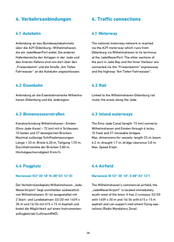28Anbindung an das Bundesautobahnnetz%u00fcber die A29 Oldenburg%u2013Wilhelmshaven,die am JadeWeserPort endet. Die anderenHafenbereiche der Anlagen in der Jade unddes Inneren Hafens sind von dort %u00fcber den%u201eFriesendamm%u201c und die Stra%u00dfe %u201eAm TiefenFahrwasser%u201c an die Autobahn angeschlossen.Kanalverbindung Wilhelmshaven%u2013Emden (Ems-Jade-Kanal %u2013 72 km) mit 6 Schleusen,15 festen und 27 beweglichen Br%u00fccken.Maximal zul%u00e4ssige Schiffsabmessungen:L%u00e4nge = 33 m, Breite 6,20 m, Tiefgang 1,70 m, Durchfahrtsh%u00f6he der Br%u00fccken 3,80 m.H%u00f6chstgeschwindigkeit 8 km/h.Mariensiel (53%u00b030%u201918%u201dN; 08%u00b003%u201912%u201dO)Der Verkehrslandeplatz Wilhelmshaven %u201eJadeWeserAirport%u201c liegt unmittelbar s%u00fcdwestlich von Wilhelmshaven. Er ist ausgestattet mit2 Start- und Landebahnen: 02/20 mit 1459 x30 m und 16/34 mit 615 x 15 m Asphalt und bietet die M%u00f6glichkeit auf einen Instrumentenanflugbetrieb (LuftraumRMZ).Anbindung an die Eisenbahnstrecke Wilhelmshaven-Oldenburg und die Jaderegion.The national motorway network is reachedvia the A29 motorway which runs fromOldenburg via Wilhelmshaven to its terminus at the JadeWeserPort. The other sections of the port in Jade Bay and the Inner Harbour are connected via the %u201cFriesendamm%u201d expressway and the highway %u201cAm Tiefen Fahrwasser%u201d.The Ems-Jade Canal (length: 72 km) connects Wilhelmshaven and Emden through 6 locks,15 fixed and 27 moveable bridges.Max. dimensions for vessels: length 33 m, beam 6.2 m, draught 1.7 m, bridge clearance 3.8 m. Max. Speed 8 kph.Mariensiel (N 53%u00b0 30%u2018 18%u201c, E 08%u00b0 03%u2018 12%u201c)The Wilhelmshaven%u2019s commercial airfield, the %u201eJadeWeserAirport%u201d is located immediately south-west of the town. It has 2 runways: 02/20 with 1459 x 30 m and 16/34 with 615 x 15 m asphalt and can support instrument flying operations (Radio Mandatory Zone).Linked to the Wilhelmshaven-Oldenburg rail route; the areas along the Jade.4. Verkehrsanbindungen 4. Traffic connections4.1 Autobahn4.3 Binnenwasserstra%u00dfen4.4 Flugplatz4.2 Eisenbahn4.1 Motorway4.3 Inland waterways4.4 Airfield4.2 Rail
