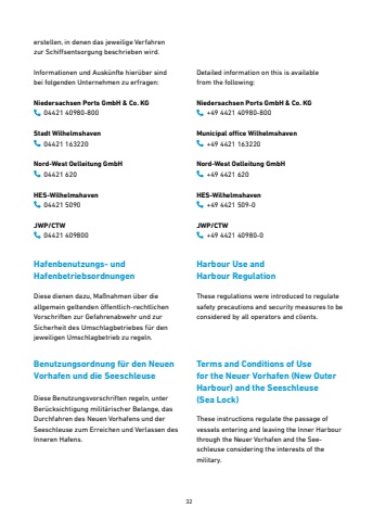 32erstellen, in denen das jeweilige Verfahrenzur Schiffsentsorgung beschrieben wird.Informationen und Ausk%u00fcnfte hier%u00fcber sindbei folgenden Unternehmen zu erfragen:Niedersachsen Ports GmbH & Co. KG04421 40980-800Stadt Wilhelmshaven04421 163220Nord-West Oelleitung GmbH04421 620HES-Wilhelmshaven04421 5090JWP/CTW04421 409800Diese dienen dazu, Ma%u00dfnahmen %u00fcber dieallgemein geltenden %u00f6ffentlich-rechtlichenVorschriften zur Gefahrenabwehr und zur Sicherheit des Umschlagbetriebes f%u00fcr den jeweiligen Umschlagbetrieb zu regeln.Diese Benutzungsvorschriften regeln, unter Ber%u00fccksichtigung milit%u00e4rischer Belange, das Durchfahren des Neuen Vorhafens und der Seeschleuse zum Erreichen und Verlassen des Inneren Hafens.These regulations were introduced to regulate safety precautions and security measures to be considered by all operators and clients.These instructions regulate the passage of vessels entering and leaving the Inner Harbour through the Neuer Vorhafen and the Seeschleuse considering the interests of themilitary.Detailed information on this is availablefrom the following:Niedersachsen Ports GmbH & Co. KG+49 4421 40980-800Municipal office Wilhelmshaven+49 4421 163220Nord-West Oelleitung GmbH+49 4421 620HES-Wilhelmshaven+49 4421 509-0JWP/CTW+49 4421 40980-0Hafenbenutzungs- undHafenbetriebsordnungenBenutzungsordnung f%u00fcr den Neuen Vorhafen und die SeeschleuseHarbour Use andHarbour RegulationTerms and Conditions of Usefor the Neuer Vorhafen (New Outer Harbour) and the Seeschleuse(Sea Lock)