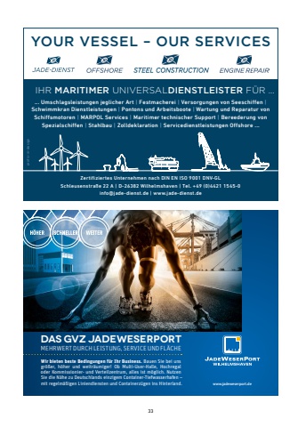 33YOUR VESSEL %u2013 OUR SERVICESZertifiziertes Unternehmen nach DIN EN ISO 9001 DNV-GLSchleusenstra%u00dfe 22 A | D-26382 Wilhelmshaven | Tel. +49 (0)4421 1545-0info@jade-dienst.de | www.jade-dienst.deprofis-in-design... Umschlagsleistungen jeglicher Art | Festmacherei | Versorgungen von Seeschiffen |Schwimmkran Dienstleistungen | Pontons und Arbeitsboote | Wartung und Reparatur von Schiffsmotoren | MARPOL Services | Maritimer technischer Support | Bereederung von Spezialschiffen | Stahlbau | Zolldeklaration | Servicedienstleistungen Offshore ...IHR MARITIMER UNIVERSALDIENSTLEISTER F%u00dcR %u2026Wir bieten beste Bedingungen f%u00fcr Ihr Business. Bauen Sie bei uns gr%u00f6%u00dfer, h%u00f6her und weitr%u00e4umiger! Ob Multi-User-Halle, Hochregal oder Kommissionier- und Verteilzentrum, alles ist m%u00f6glich. Nutzen Sie die N%u00e4he zu Deutschlands einzigem Container-Tiefwasserhafen %u2013mit regelm%u00e4%u00dfigen Liniendiensten und Containerz%u00fcgen ins Hinterland.Das GVZ JadeWeserPortMEHRWERT DURCH LEISTUNG, SERVICE UND FL%u00c4CHEwww.jadeweserport.de
