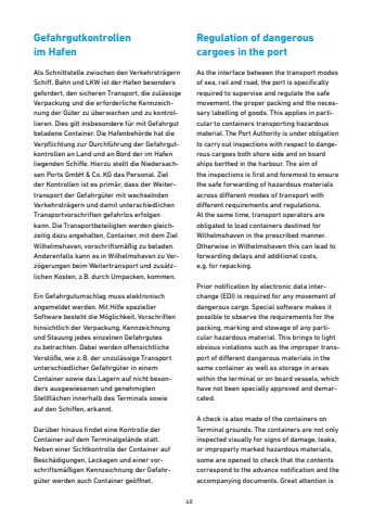 40Als Schnittstelle zwischen den Verkehrstr%u00e4gern Schiff, Bahn und LKW ist der Hafen besonders gefordert, den sicheren Transport, die zul%u00e4ssige Verpackung und die erforderliche Kennzeichnung der G%u00fcter zu %u00fcberwachen und zu kontrollieren. Dies gilt insbesondere f%u00fcr mit Gefahrgut beladene Container. Die Hafenbeh%u00f6rde hat die Verpflichtung zur Durchf%u00fchrung der Gefahrgutkontrollen an Land und an Bord der im Hafen liegenden Schiffe. Hierzu stellt die Niedersachsen Ports GmbH & Co. KG das Personal. Ziel der Kontrollen ist es prim%u00e4r, dass der Weitertransport der Gefahrg%u00fcter mit wechselnden Verkehrstr%u00e4gern und damit unterschiedlichen Transportvorschriften gefahrlos erfolgen kann. Die Transportbeteiligten werden gleichzeitig dazu angehalten, Container, mit dem Ziel Wilhelmshaven, vorschriftsm%u00e4%u00dfig zu beladen. Anderenfalls kann es in Wilhelmshaven zu Verz%u00f6gerungen beim Weitertransport und zus%u00e4tzlichen Kosten, z.B. durch Umpacken, kommen.Ein Gefahrgutumschlag muss elektronischangemeldet werden. Mit Hilfe speziellerSoftware besteht die M%u00f6glichkeit, Vorschriften hinsichtlich der Verpackung, Kennzeichnung und Stauung jedes einzelnen Gefahrgutes zu betrachten. Dabei werden offensichtliche Verst%u00f6%u00dfe, wie z.B. der unzul%u00e4ssige Transport unterschiedlicher Gefahrg%u00fcter in einemContainer sowie das Lagern auf nicht besonders ausgewiesenen und genehmigtenStellfl%u00e4chen innerhalb des Terminals sowieauf den Schiffen, erkannt.Dar%u00fcber hinaus findet eine Kontrolle derContainer auf dem Terminalgel%u00e4nde statt.Neben einer Sichtkontrolle der Container auf Besch%u00e4digungen, Leckagen und einer vorschriftsm%u00e4%u00dfigen Kennzeichnung der Gefahrg%u00fcter werden auch Container ge%u00f6ffnet.As the interface between the transport modes of sea, rail and road, the port is specificallyrequired to supervise and regulate the safemovement, the proper packing and the necessary labelling of goods. This applies in particular to containers transporting hazardousmaterial. The Port Authority is under obligation to carry out inspections with respect to dangerous cargoes both shore side and on boardships berthed in the harbour. The aim ofthe inspections is first and foremost to ensurethe safe forwarding of hazardous materials across different modes of transport withdifferent requirements and regulations.At the same time, transport operators areobligated to load containers destined forWilhelmshaven in the prescribed manner.Otherwise in Wilhelmshaven this can lead to forwarding delays and additional costs,e.g. for repacking.Prior notification by electronic data interchange (EDI) is required for any movement of dangerous cargo. Special software makes it possible to observe the requirements for the packing, marking and stowage of any particular hazardous material. This brings to light obvious violations such as the improper transport of different dangerous materials in the same container as well as storage in areas within the terminal or on board vessels, which have not been specially approved and demarcated.A check is also made of the containers onTerminal grounds. The containers are not only inspected visually for signs of damage, leaks,or improperly marked hazardous materials, some are opened to check that the contents correspond to the advance notification and the accompanying documents. Great attention is Gefahrgutkontrollenim HafenRegulation of dangerouscargoes in the port