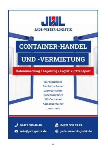 41Hafenumschlag / Lagerung / Logistik / TransportJADE-WESER-LOGISTIKinfo@jwlogistik.de jade-weser-logistik.de04421 500 49 40 04421 500 49 49CONTAINER-HANDELUND -VERMIETUNGfifffflffiflffi%u001a%u0019%u0018%u0017%u001a%u0016ffl%u0015%u0014%u0018%u001a%u0017%u0019%u0013fflflffi%u001a%u0019%u0018%u0017%u001a%u0016ffl%u0012%u0018%u0011%u0016fflflffi%u001a%u0019%u0018%u0017%u001a%u0016ffl%u0010%u000f%u000eflflffi%u001a%u0019%u0018%u0017%u001a%u0016ffl%u0015%u000c%u000b%u000bffi%u001a%u0019%u0018%u0017%u001a%u0016ffl%u0009%u0018%u000e%u000e%u0016%u001aflffi%u001a%u0019%u0018%u0017%u001a%u0016ffl%u0008%u0008%u0008%u000f%u001a%u0007%u0015%u0006%u0016ffl