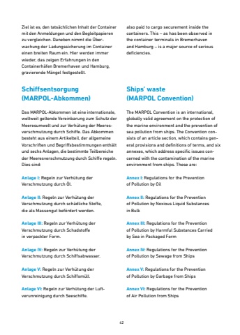 42Schiffsentsorgung(MARPOL-Abkommen)Ships%u2019 waste(MARPOL Convention)Das MARPOL-Abkommen ist eine internationale,weltweit geltende Vereinbarung zum Schutz der Meeresumwelt und zur Verh%u00fctung der Meeresverschmutzung durch Schiffe. Das Abkommen besteht aus einem Artikelteil, der allgemeine Vorschriften und Begriffsbestimmungen enth%u00e4lt und sechs Anlagen, die bestimmte Teilbereicheder Meeresverschmutzung durch Schiffe regeln.Dies sind:Anlage I: Regeln zur Verh%u00fctung derVerschmutzung durch %u00d6l.Anlage II: Regeln zur Verh%u00fctung derVerschmutzung durch sch%u00e4dliche Stoffe,die als Massengut bef%u00f6rdert werden.Anlage III: Regeln zur Verh%u00fctung derVerschmutzung durch Schadstoffein verpackter Form.Anlage IV: Regeln zur Verh%u00fctung derVerschmutzung durch Schiffsabwasser.Anlage V: Regeln zur Verh%u00fctung derVerschmutzung durch Schiffsm%u00fcll.Anlage VI: Regeln zur Verh%u00fctung der Luftverunreinigung durch Seeschiffe.The MARPOL Convention is an international, globally valid agreement on the protection of the marine environment and the prevention of sea pollution from ships. The Convention consists of an article section, which contains general provisions and definitions of terms, and six annexes, which address specific issues concerned with the contamination of the marine environment from ships. These are:Annex I: Regulations for the Preventionof Pollution by OilAnnex II: Regulations for the Preventionof Pollution by Noxious Liquid Substancesin BulkAnnex III: Regulations for the Preventionof Pollution by Harmful Substances Carriedby Sea in Packaged FormAnnex IV: Regulations for the Preventionof Pollution by Sewage from ShipsAnnex V: Regulations for the Preventionof Pollution by Garbage from ShipsAnnex VI: Regulations for the Preventionof Air Pollution from ShipsZiel ist es, den tats%u00e4chlichen Inhalt der Containermit den Anmeldungen und den Begleitpapieren zu vergleichen. Daneben nimmt die %u00dcberwachung der Ladungssicherung im Container einen breiten Raum ein. Hier werden immer wieder, das zeigen Erfahrungen in denContainerh%u00e4fen Bremerhaven und Hamburg, gravierende M%u00e4ngel festgestellt.also paid to cargo securement inside thecontainers. This %u2013 as has been observed inthe container terminals in Bremerhavenand Hamburg %u2013 is a major source of serious deficiencies.