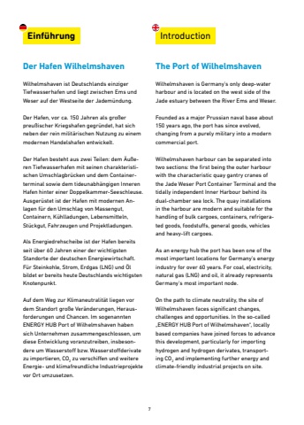 7Einf%u00fchrung IntroductionWilhelmshaven ist Deutschlands einziger Tiefwasserhafen und liegt zwischen Ems und Weser auf der Westseite der Jadem%u00fcndung.Der Hafen, vor ca. 150 Jahren als gro%u00dferpreu%u00dfischer Kriegshafen gegr%u00fcndet, hat sich neben der rein milit%u00e4rischen Nutzung zu einem modernen Handelshafen entwickelt.Der Hafen besteht aus zwei Teilen: dem %u00c4u%u00dferen Tiefwasserhafen mit seinen charakteristischen Umschlagbr%u00fccken und dem Containerterminal sowie dem tideunabh%u00e4ngigen Inneren Hafen hinter einer Doppelkammer-Seeschleuse.Ausger%u00fcstet ist der Hafen mit modernen Anlagen f%u00fcr den Umschlag von Massengut,Containern, K%u00fchlladungen, Lebensmitteln, St%u00fcckgut, Fahrzeugen und Projektladungen.Als Energiedrehscheibe ist der Hafen bereits seit %u00fcber 60 Jahren einer der wichtigsten Standorte der deutschen Energiewirtschaft.F%u00fcr Steinkohle, Strom, Erdgas (LNG) und %u00d6lbildet er bereits heute Deutschlands wichtigsten Knotenpunkt. Auf dem Weg zur Klimaneutralit%u00e4t liegen vor dem Standort gro%u00dfe Ver%u00e4nderungen, Herausforderungen und Chancen. Im sogenannten ENERGY HUB Port of Wilhelmshaven haben sich Unternehmen zusammengeschlossen, um diese Entwicklung voranzutreiben, insbesondere um Wasserstoff bzw. Wasserstoffderivate zu importieren, CO2 zu verschiffen und weitere Energie- und klimafreundliche Industrieprojektevor Ort umzusetzen.Wilhelmshaven is Germany%u2019s only deep-water harbour and is located on the west side of the Jade estuary between the River Ems and Weser.Founded as a major Prussian naval base about 150 years ago, the port has since evolved, changing from a purely military into a modern commercial port.Wilhelmshaven harbour can be separated into two sections: the first being the outer harbour with the characteristic quay gantry cranes of the Jade Weser Port Container Terminal and the tidally independent Inner Harbour behind its dual-chamber sea lock. The quay installations in the harbour are modern and suitable for the handling of bulk cargoes, containers, refrigerated goods, foodstuffs, general goods, vehicles and heavy-lift cargoes.As an energy hub the port has been one of the most important locations for Germany%u2019s energy industry for over 60 years. For coal, electricity, natural gas (LNG) and oil, it already represents Germany%u2019s most important node. On the path to climate neutrality, the site of Wilhelmshaven faces significant changes, challenges and opportunities. In the so-called %u201eENERGY HUB Port of Wilhelmshaven%u201c, locally based companies have joined forces to advance this development, particularly for importing hydrogen and hydrogen derivates, transporting CO2 and implementing further energy and climate-friendly industrial projects on site. Der Hafen Wilhelmshaven The Port of Wilhelmshaven